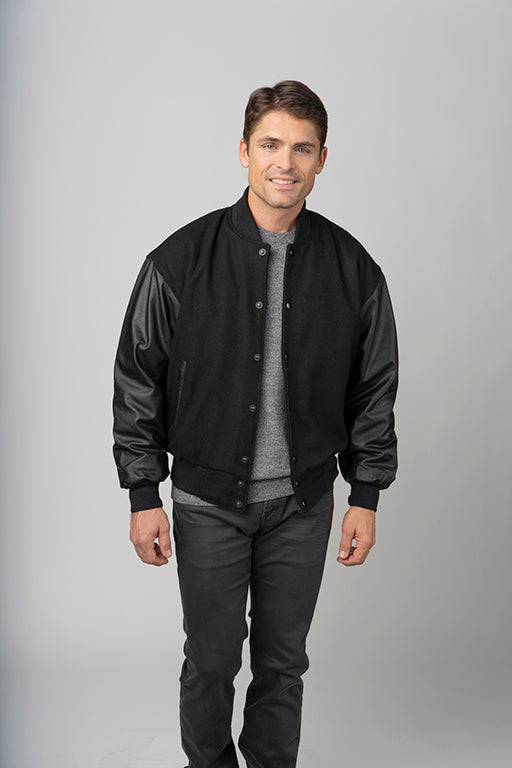 Complementing the wool body are genuine cowhide leather sleeves, which provide a striking contrast in both texture and appearance. The cowhide leather is known for its robustness and longevity, making it an ideal material for sleeves that often endure more wear and tear. The leather sleeves add a layer of sophistication and durability to the jacket, enhancing its classic varsity appeal.